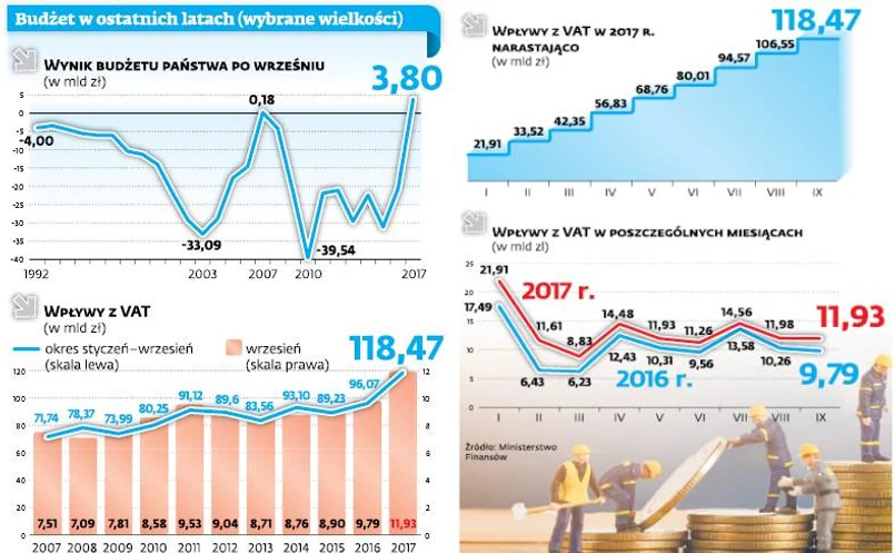 Inna, stopniowo wyczerpująca się rezerwa to polityka zwrotów VAT. Ekonomista zwraca uwagę, że przyspieszenie wypłat w grudniu 2016 r. bardzo poprawiło wyniki pierwszych miesięcy tego roku. W styczniu wpływy wzrosły co prawda „tylko” o 25 proc. rok do roku, ale już w lutym były wyższe aż o 80 proc., a w marcu o ponad 40 proc. – Ale ten efekt już nie jest widoczny. Dochody z VAT co prawda są wyższe niż rok temu, ale ich dynamika się ustabilizowała – mówi Grzegorz Maliszewski. Po dziewięciu miesiącach są większe o ponad 23 proc. W samym wrześniu były wyższe o jedną piątą. ⒸⓅ