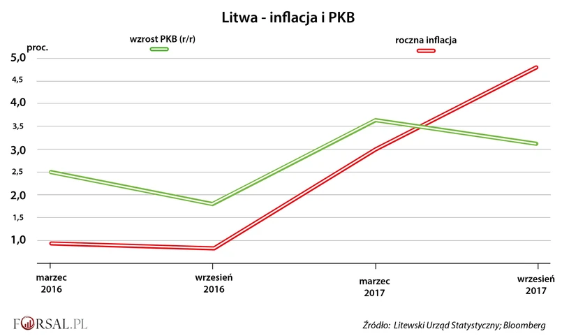 Poza działaniami Brukseli we wszystkich krajach, w tym także na Litwie, wpływ na rozwój gospodarczy mają także lokalne czynniki. Na przykład litewski rynek pracy cierpi na niedobór siły roboczej, przez co roczny poziom płac zwiększył się o 8,7 procent w drugim kwartale tego roku. Z kolei rządowa walka o obniżenie spożycia alkoholu na Litwie, które jest najwyższe na świecie, sprawiła, że w ciągu ostatnich 12 miesięcy piwo podrożało prawie o jedną trzecią.