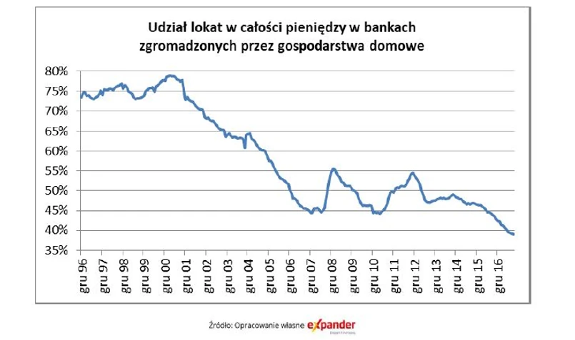 Dwadzieścia lat temu trzy czwarte swoich pieniędzy w banku trzymaliśmy na lokatach. Dziesięć lat temu było to już tylko 45%. Obecnie, ten udział spadł do najniższego poziomu w historii (39%). Wiele wskazuje na to, że dużo gorzej niż dziś już nie będzie. Coraz więcej elementów przemawia bowiem za tym, że w drugiej połowie przyszłego roku może zostać rozpoczęty cykl podwyżek stóp procentowych. To zwykle zachęcało nas do korzystania z lokat, co doskonale widać na załączonym wykresie. W roku 2008 i latach 2011-2012 podwyżki podbiły udział lokat z ok. 45% do ok. 55%.