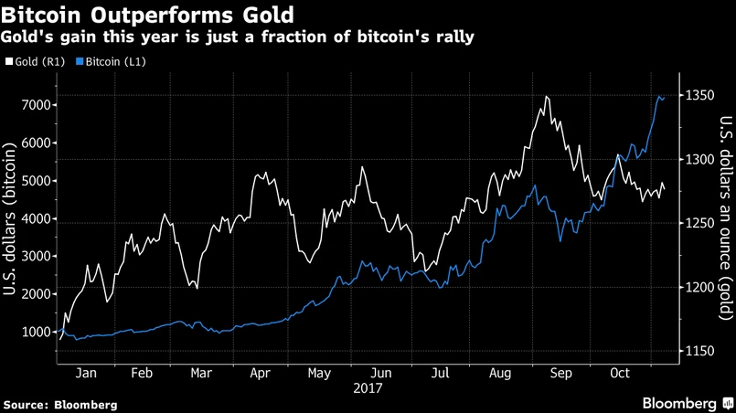 Od ostatniego tegorocznego szczytu (z 8 września) cena złota spadła o około 6 procent, zmniejszając tym samym zysk w 2017 r. do 11 procent. Natomiast kurs bitcoina podskoczył w tym roku ponad siedmiokrotnie. Jego cena rosła ponad 13 razy szybciej niż najlepiej sprzedający się towar monitorowany przez agencję Bloomberg.