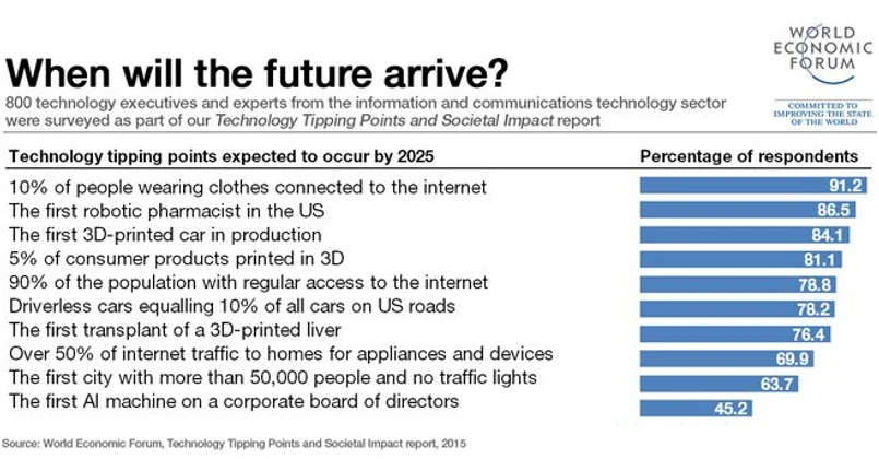 Mike Morami i Lin Yang w serwisie weforum.org roztoczyli wizję przyszłości: budzisz się wiosną 2030 roku. Twoja sypialnia odwzorowuje koncepcję Internetu Rzeczy – zasilane energią słoneczną e-okna otwierają się, z ukrytych głośników sączy się melodyjna muzyka, a inteligentne oświetlenie odtwarza fotografie wschodów słońca z twoich ostatnich wakacji. Twój prysznic używa bardzo mało wody i mydła. Odzyskuje wodę i oddaje nadmiar ciepła z powrotem do zintegrowanego systemu operacyjnego twojego domu. Podczas gdy się ubierasz, asystent o sztucznej inteligencji podpowiada twój plan dnia i gra twoje ulubione piosenki. Nadal zaczynasz dzień od kofeiny, ale pochodzi ona z lodówki IoT (Internet of Things, Internet Rzecz), która przyrządza kawę równie dobrą, co w kawiarni. Gorące śniadanie, dostosowane do twoich konkretnych potrzeb żywieniowych (na podstawie analizy chemicznej z „inteligentnej toalety”) czeka na ciebie w kuchni. Kiedy nadejdzie czas, aby wyjść z domu, system transportu na żądanie zapewni trzy samochody czekające na ciebie, twojego współmałżonka i dzieci. Na drodze samochody osobowe i ciężarowe bez kierowcy poruszają się z matematyczną precyzją, bez korków, rutynowych przeglądów czy napadów szału na drodze. Wskaźniki wypadków są bliskie zeru.