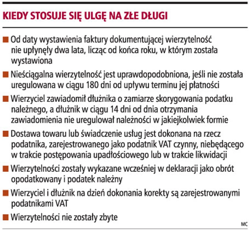 Formalną podstawą do skorzystania z ulgi na złe długi jest obowiązkowe zawiadomienie dłużnika o zamiarze skorygowania podatku należnego. Jeżeli dłużnik w ciągu 14 dni od dnia otrzymania zawiadomienia nie uregulował należności w jakiejkolwiek formie, to warunkiem dokonania korekty przez przedsiębiorcę jest uzyskanie przez wierzyciela takiego potwierdzenia. Korekta VAT należnego u sprzedawcy (dostawcy) powoduje konieczność korekty odliczenia VAT u dłużnika (nabywcy). W konsekwencji to nierzetelny kontrahent ponosi ciężar finansowania należnego VAT.