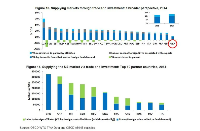 Z danych Organizacji Współpracy Gospodarczej i Rozwoju (OECD) wynika, że pod względem zarówno przepływów handlowych, jak i inwestycji, gospodarka Stanów Zjednoczonych najmniej powiązana jest z handlem zagranicznym w grupie badanych państw OECD.