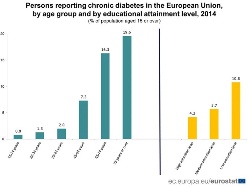 Międzynarodowa Federacja Diabetologiczna szacuje, że w 2015 r. wydatki związane z leczeniem cukrzycy stanowiły 9 proc. budżetów ochrony zdrowia w państwach europejskich, co stanowi równowartość 156 mld dolarów. Odsetek osób cierpiących na przewlekłą cukrzycę różni się w zależności od grupy wiekowej. Im starsza grupa wiekowa, tym więcej chorych. Odsetek diabetyków w UE spada wraz ze wzrostem poziomu wykształcenia: to 10,8 proc. wśród osób o niskim poziomie wykształcenia, był on prawie o połowę niższy (5,7 proc.) dla osób o średnim poziomie wykształcenia i jeszcze niższy, tj. o 4,2 proc. wykształconej populacji. Już 1 na 10 Francuzów cierpi na przewlekłą cukrzycę. W Portugalii chorych jest 9,3 proc. społeczeństwa, w Grecji – 9,2 proc.