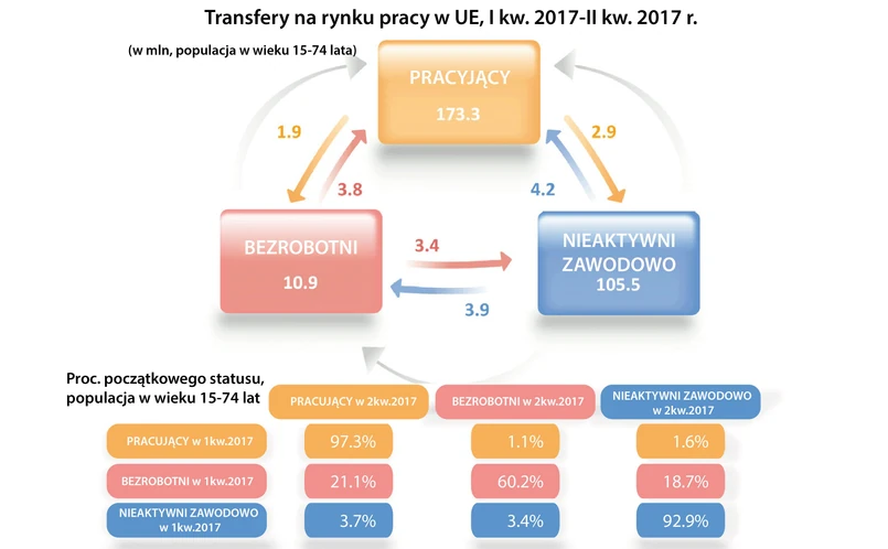 W całej UE spośród wszystkich osób zatrudnionych początkowo w pierwszym kwartale 2017 r., 1,9 mln (1,1 proc.) straciło pracę w drugim kwartale 2017 r., a 2,9 mln (1,6 proc.) przeszło w bezczynność zawodową.