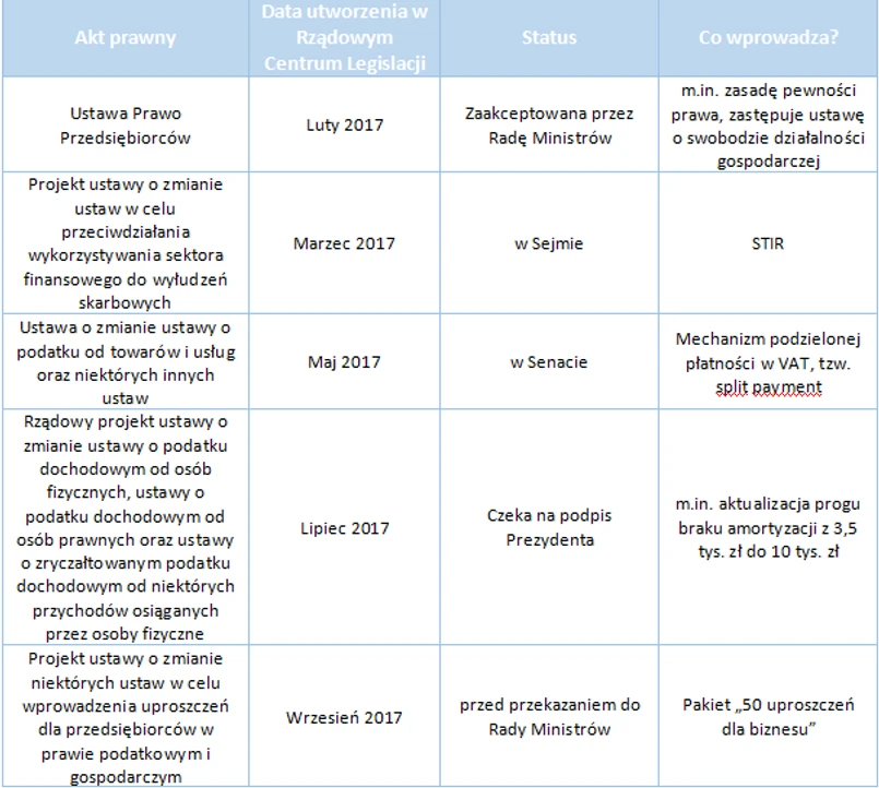 Trudno się z powyższym stanowiskiem nie zgodzić, zwłaszcza, jeśli wziąć pod uwagę pozostałe projekty, którymi obecnie zajmują się rządzący, a które rewolucjonizują życie przedsiębiorców. Przede wszystkim warto wspomnieć o zaakceptowaniu w zeszłym tygodniu przez rząd Prawa przedsiębiorców – ustawy zmieniającej rdzeń przepisów o prowadzeniu działalności. W międzyczasie Sejm uchwalił nowelizację przepisów o podatku dochodowym, wprowadzając m.in. wyższy próg braku amortyzacji, o czym Tax Care sygnalizował na początku listopada. Teraz parlament zajmuje się jeszcze nowatorskimi ustawami o split paymencie czy STIR, które również były przedmiotem analizy Tax Care. Pakiet „50 uproszczeń” poznaliśmy pod koniec września br. i jest on obecnie opiniowany. To naprawdę dużo radykalnych zmian na raz i przez to, mimo, że wszystkie z założenia mają ułatwić przedsiębiorcom życie, w rzeczywistości mogą utrudnić przedsiębiorcom prowadzenie biznesu.