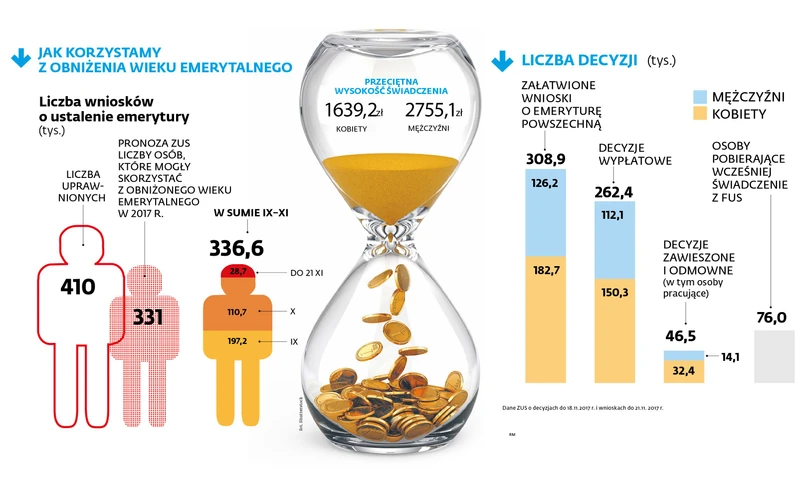Łącznie w tym roku dzięki ustawie obniżającej wiek na emeryturę może odejść 410 tys. osób. ZUS, szacując koszty przywrócenia dawnych zasad, oparł się na danych z poprzednich lat, z których wynikało, że przeciętnie w pierwszym możliwym momencie po świadczenie zgłasza się nieco ponad 80 proc. uprawnionych. Ten odsetek już jest wyższy.