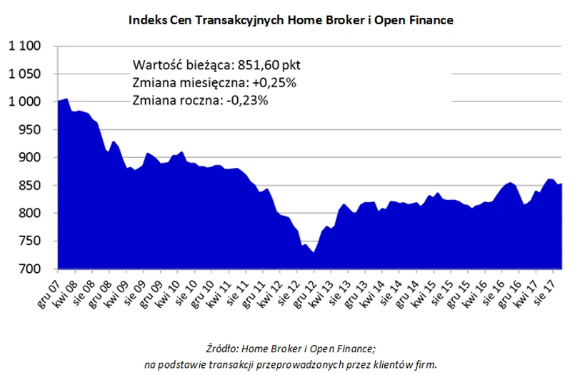 Najnowszy odczyt Indeksu Cen Transakcyjnych, obrazującego zmiany cen na rynku mieszkaniowym w najważniejszych miastach Polski, wynosi 851,6 punktów, o 0,23 proc. mniej niż rok temu i o 3,92 proc. więcej niż dwa lata temu. Ceny mieszkań są w Polsce stabilne, acz na poziomie wyższym niż w okresie stabilizacji pomiędzy połową 2013 i połową 2016 roku. Obliczany od końca 2007 r. Indeks powstaje na bazie transakcji dokonanych przez klientów Home Brokera i Open Finance, jest więc realnym odbiciem tego, ile kosztują mieszkania, którymi handluje się na rynku, a nie życzeń sprzedających, które widać w cenach ofertowych.