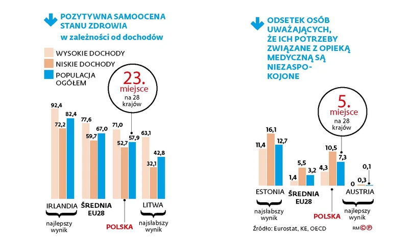 Kiedy zapytano Polaków, jak oceniają swój stan zdrowia, okazało się, że w przypadku osób i rodzin zaliczanych do 20 proc. populacji z najwyższymi dochodami nie jest tak źle: 71 proc. uznało, że jest dobry. Ale tak samo odpowiedziało już tylko niespełna 53 proc. ankietowanych mieszczących się w 20 proc. z najmniejszymi dochodami. W porównaniu z resztą Europy czujemy się schorowani: średnio ok. 80 proc. Irlandczyków czy Szwedów uważa, że z ich zdrowiem jest wszystko w porządku. U nas mniej niż 58 proc. Analizę systemów ochrony zdrowia wszystkich państw UE przygotowała Komisja Europejska we współpracy z OECD.