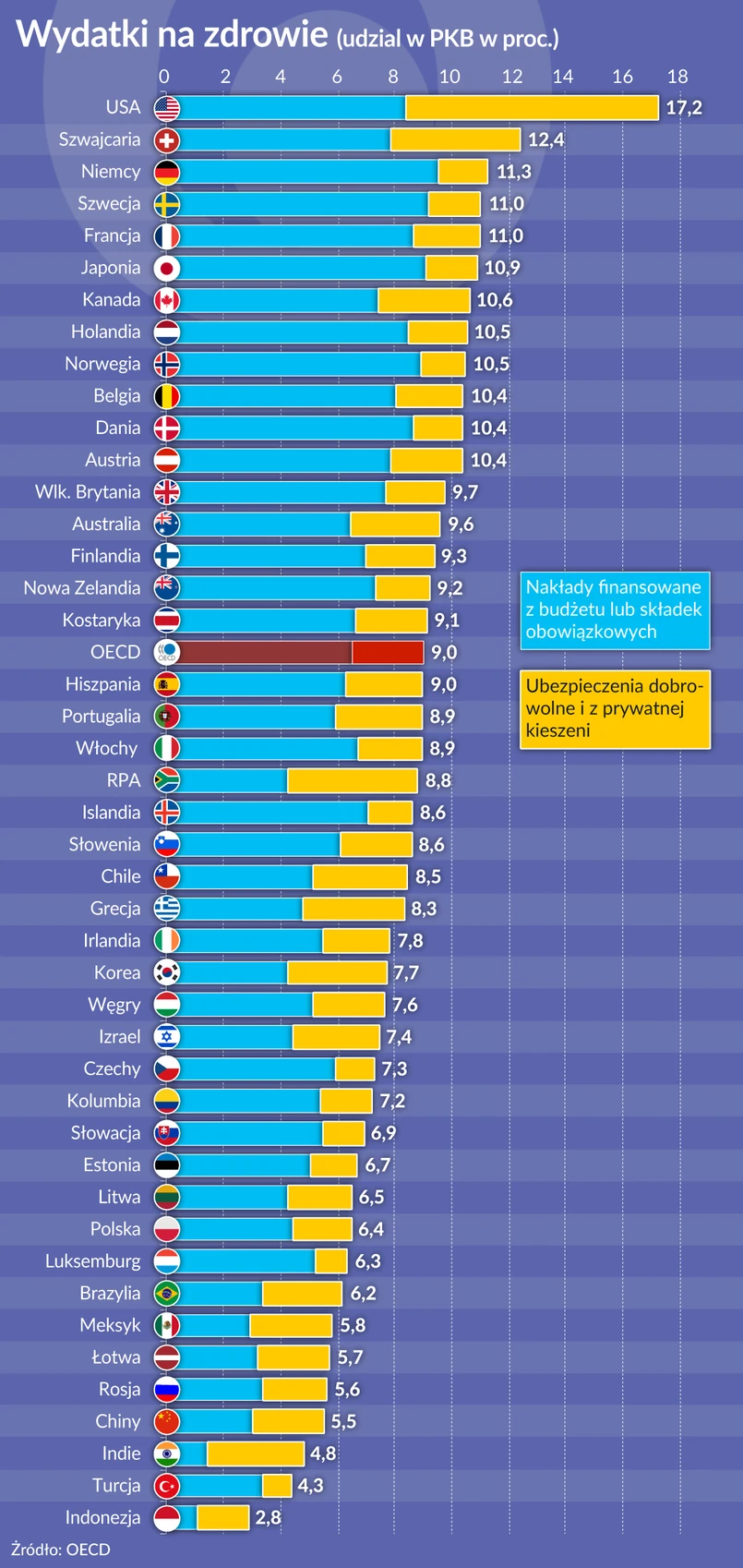 Średnio jedna piąta wydatków na zdrowie w krajach OECD finansowana jest z kieszeni prywatnych. Są jednak pod tym względem duże różnice. Największy udział prywatnego finansowania notowany jest na Łotwie, gdzie sięga on (tu raport OECD dysponuje danymi za rok 2015) 41,6 proc. Niewiele mniejszy jest w przypadku Meksyku (41,4 proc.), Korei (36,8 proc.) i Grecji (35,6 proc.). Polska (23,2 proc.) sytuuje się na średnim poziomie. Najniższy udział (6,8 proc.) notowany jest we Francji.