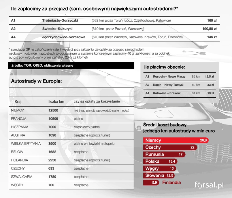 Podróż z Katowic do Krakowa – 60-km odcinkiem trasy A4 pod zarządem Stalexportu SA - kosztuje właściciela samochodu osobowego 13 zł, a przejażdżka zaledwie 85 km fragmentem autostrady A1 z Pomorza do Kujawsko-Pomorskiego zarządzanym przez spółkę Gdańsk Transport Company - 15 zł. To odpowiednio: 22 gr, 20 gr i 18 gr za każdy kilometr.
