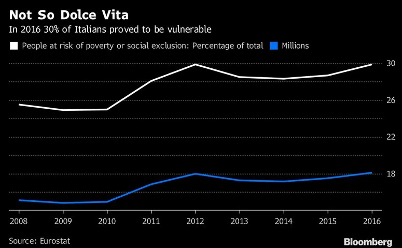 Jak donoszą Lorenzo Totaro oraz Giovanni Salzano w serwisieBloomberg, w ubiegłym roku prawie jeden na trzech Włochów znalazł się w grupie zagrożenia. We Włoszech od czasu kryzysu finansowego w 2008 r. liczba osób, które mogą zostać dotknięte ubóstwem, powiększyła się o ponad 3 miliony. To największy wzrost w Europie. Mimo tego, że gospodarka kraju podniosła się z kryzysu, niekorzystna tendencja wciąż się pogłębia.
