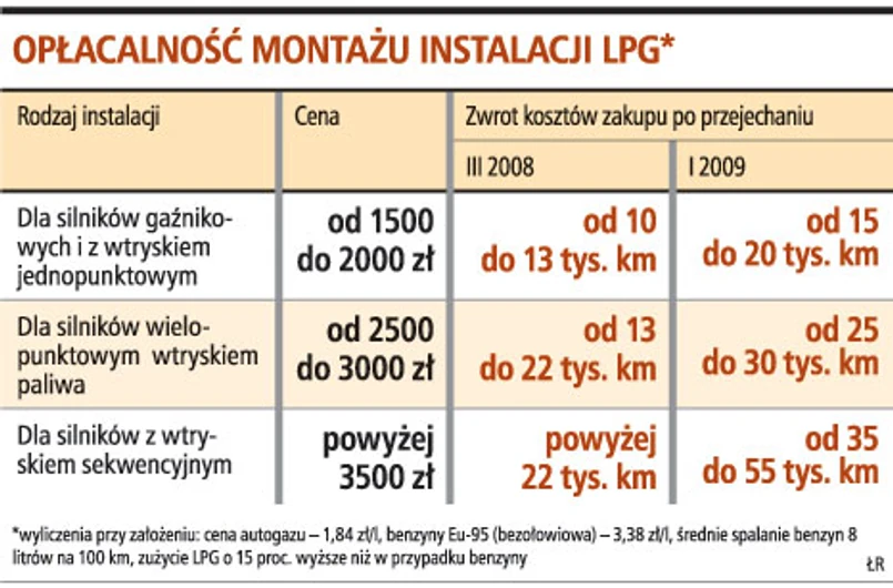 Aby montaż instalacji przestał być opłacalny, cena litra gazu musi przekroczyć 60 proc. ceny litra benzyny. Obecnie jest to 54,5 proc. (w 2007 roku 49 proc., a w I półroczu 2008 r. - 51 proc.). Analitycy przekonują, że korzystna relacja cenowa między LPG a etyliną utrzyma się minimum kilka lat.