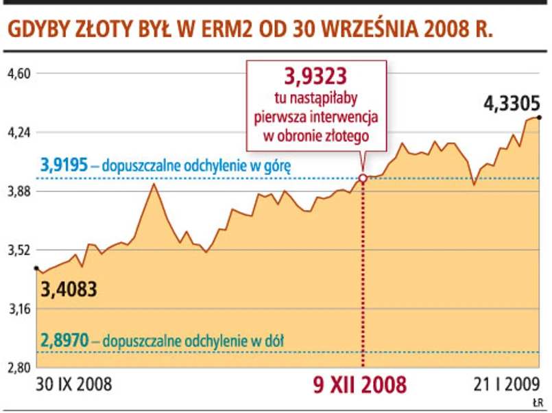 Krótka symulacja wystarczy, by uświadomić sobie, na jak duże ryzyko wystawiony zostałby NBP, gdyby złoty był w ERM2 - w którym wahania kursu waluty są ograniczone - na początku głównej fali kryzysu, czyli pod koniec września ubiegłego roku. Pierwszą interwencję w obronie naszej waluty bank centralny musiałby przeprowadzić już dwa miesiące później. Prawdopodobnie na jednej by się nie skończyło, bo kurs złotego od początku grudnia trwale wykraczał poza dopuszczalne pasmo wahań z symulacji.