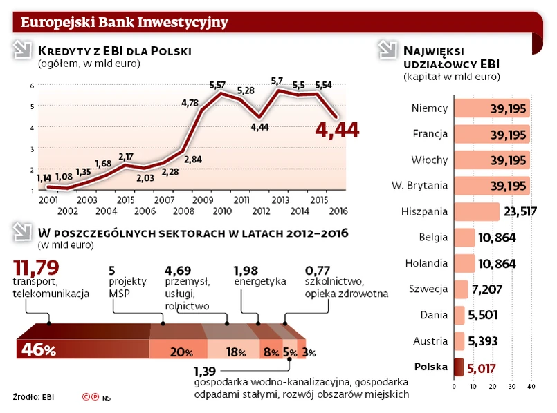 Chociaż akceptacje kredytów należą do specjalnych komitetów, to posiadanie stałego wiceprezesa znacznie wzmocniłoby naszą pozycję i wpływ na kierunki rozwoju. Widać to po działalności banku w 2016 r. Polska była nominalnie szóstym beneficjentem finansowania z banku. Wyprzedziły nas kraje o największych udziałach i Hiszpanie. W sumie bank udzielił w ubiegłym roku pożyczek na 83,5 mld euro, z czego w Polsce 4,44 mld euro.