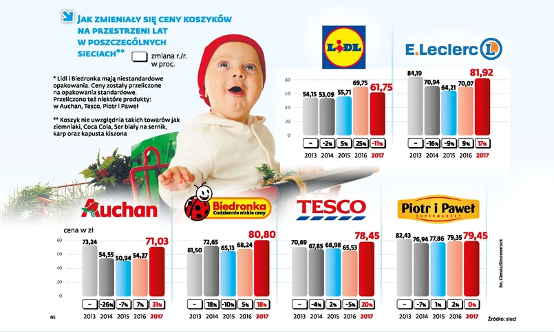 Choć sieci handlowe zapowiadały walkę o klienta i niepoddawanie się naciskom producentów dążących do podnoszenia cen, przygotowanie tegorocznych świąt Bożego Narodzenia będzie droższe niż przed rokiem. Za koszyk produktów na wigilijny stół zapłacimy w zależności od marki sklepu od 17 proc. do ponad 30 proc. więcej. Wyjątek stanowią dwie sieci: Lidl oraz Piotr i Paweł. W przypadku tej pierwszej ceny zmalały rok do roku i to o 11 proc. Drugiej – utrzymały się na tym samym poziomie. Co więcej, Piotr i Paweł należy do tych sieci, w których ceny pozostają stabilne już kolejny rok z rzędu.