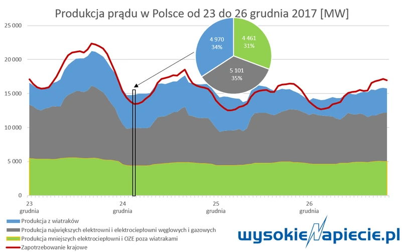 Na tym jednak nie koniec historycznych wyników. Przy utrzymującym się silnym wietrze i spadającym na Święta zapotrzebowaniu odbiorców, wiatraki pokryły w końcu aż 40% zapotrzebowania na moc całej Polski. W poniedziałek, 25 grudnia, nad ranem odbiorcy potrzebowali jedynie 12,5 GW (z czego 0,8 GW generował popyt największych polskich magazynów energii czyli szczytowo-pompowych elektrowni wodnych), a wiatraki dostarczały w tym czasie niemal 5 GW mocy.