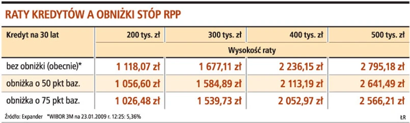Ci, którym udało się wziąć kredyty hipoteczne, mogą więc zacierać ręce. Kolejne obniżki stóp RPP powinny być dla banków impulsem, by zmienić poziom oprocentowania. Zwłaszcza dla tych, które opierają je na trzymiesięcznym WIBOR-ze. Zresztą trzymiesięczny WIBOR spadł ostatnio o około 0,5 pkt proc., co może oznaczać, że 50-punktowa obniżka stóp jest już zdyskontowana.