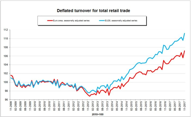 Sprzedaż detaliczna w strefie euro w listopadzie 2017 r., w ujęciu miesiąc do miesiąca, wzrosła o 1,5 proc., a miesiąc wcześniej spadła o 1,1 proc. - poinformował Eurostat, biuro statystyczne Unii Europejskiej, w komunikacie.