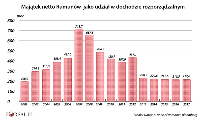 Rząd Rumunii podniósł wynagrodzenia w sektorze publicznym i jednocześnie obniżył podatki. Niestety, pomimo tych zabiegów majątek Rumunów - czyli aktywa netto obywateli jako udział w dochodzie rozporządzalnym - pozostaje mniej więcej na takim samym poziomie jak pięć lat temu.
