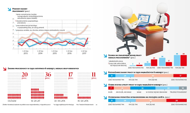 Z badań wynika również, że co piąty pracownik zmienił pracodawcę w drugiej połowie ubiegłego roku. Piotr Bujak, główny ekonomista PKO BP, uważa, że te dane są zawyżone. W ciągu półrocza pracodawców musiałoby zmienić aż 3 mln pracowników, a w całym roku 6 mln. Tymczasem z danych GUS wynika, że w ciągu roku zwalnia się ok. 1,8 mln osób (część wielokrotnie), nie licząc sektora mikroprzedsiębiorstw. – Prawdopodobnie próba do badania nie w pełni reprezentuje rynek pracy. Ale niezależnie od wyników ważne są tendencje, jakie można obserwować na ich podstawie – podkreśla Bujak. Z badań wynika, że pracę zmieniło o 9 pkt proc. mniej osób niż w rekordowej pod tym względem I połowie 2016 r.