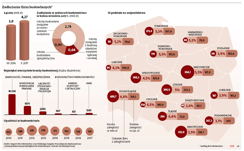 Efektem jest rosnące zadłużenie branży. W BIG InfoMonitor wynosi 4,27 mld zł, czyli o 470 mln zł więcej niż przed rokiem. Najgorzej radzą sobie przedsiębiorstwa z Mazowsza. Są zadłużone łącznie na 654,1 mln zł. Rekordzista pochodzi z łódzkiego – zalega z płatnością 156,8 mln zł. – Problem z terminową spłatą zadłużenia ma co siódma firma zarejestrowana jako spółka prawa handlowego oraz co 23. funkcjonująca jako działalność gospodarcza – mówi Sławomir Grzelczak, prezes BIG InfoMonitor. W sumie problem ze spłatą ma aż 31852 przedsiębiorstw z 646,2 tys. działających w branży, czyli 4,9 proc., co nie jest najgorszym wynikiem na tle innych sektorów. – Firmy budowlane zalegają z płatnościami przede wszystkim ubezpieczycielom, leasingodawcom czy sobie nawzajem – podkreśla Rafał Bałdys-Rembowski.