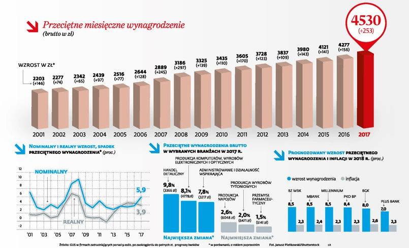 Z danych GUS wynika, że najbardziej, bo od 7,3 proc. do 9,8 proc., wzrosły, poza wyjątkami, wynagrodzenia w branżach, w których od lat zarobki należą do najniższych: w przemyśle odzieżowym, spożywczym i meblarskim, w handlu detalicznym oraz w zakładach zajmujących się tzw. administrowaniem i działalnością wspierającą, a więc m.in. w firmach ochroniarskich i sprzątających. ⒸⓅ