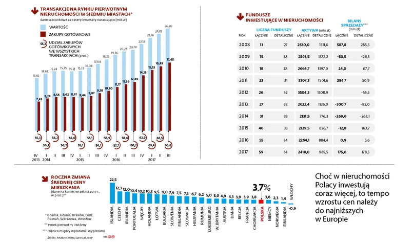 Z szacunków Narodowego Banku Polskiego wynika, że na siedmiu największych rynkach nieruchomości w kraju wydaliśmy na mieszkania w ciągu roku 26 mld zł. 17 mld zł stanowiły transakcje gotówkowe. Jeszcze trzy lata temu ta kwota była o 50 proc. mniejsza. Kupione w ten sposób nieruchomości z reguły trafiają na wynajem. Saldo napływu kapitału do specjalizujących się w tej klasie aktywów funduszy było w zeszłym roku najwyższe od dekady. Jak oszacowała firma Analizy Online, wyniosło jednak niecałe 200 mln zł. Różnica między skalą bezpośrednich inwestycji i wpływów do funduszy pokazuje, jak duże pole do działania mają firmy, które oferują produkty powiązane z rynkiem nieruchomości.
