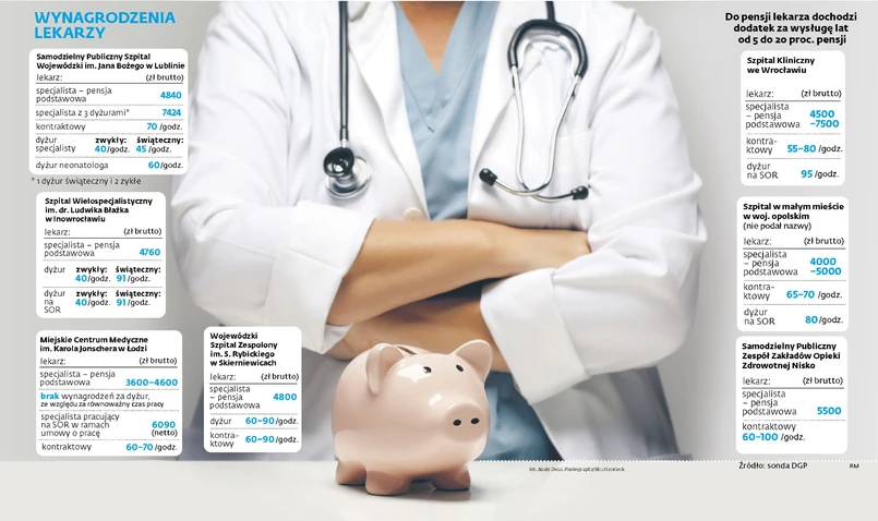 – U nas średnie wynagrodzenie lekarza specjalisty wynosi ok. 4600 zł brutto bez dyżurów – mówi Robert Krawczak, dyrektor warszawskiego szpitala dziecięcego. Podobna stawka obowiązuje w Szpitalu Wielospecjalistycznym im. dr. Ludwika Błażka w Inowrocławiu. Nieco wyższa – 4800 zł – jest w Wojewódzkim Szpitalu Zespolonym im. Stanisława Rybickiego w Skierniewicach. Z tego trendu wyłamuje się Samodzielny Publiczny Zespół Zakładów Opieki Zdrowotnej w Nisku, gdzie wynagrodzenie podstawowe dla specjalisty wynosi 5500 zł brutto, czy Szpital Kliniczny we Wrocławiu, gdzie podstawa sięga 7500 zł.