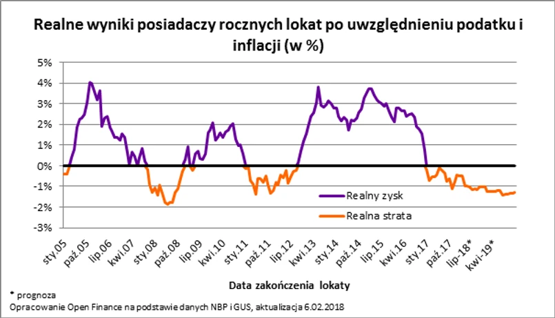 Chodzi o to, że inflacja pochłania wartość oszczędności dwa razy szybciej niż banki dopisują do nich odsetki. Wszystko przez to, że dziś przeciętna nowo założona lokata roczna była w grudniu 2017 roku oprocentowana na niewiele ponad 1,6% (dane NBP), a od tego wyniku należy odjąć podatek (19%), co daje odsetki „na rękę” na poziomie niewiele ponad 1,3%. Efekt jest więc zbyt mizerny, aby pokonać inflację, która zgodnie z ostatnią projekcją inflacji NBP ma być pod koniec 2018 roku na poziomie około 2,4%.