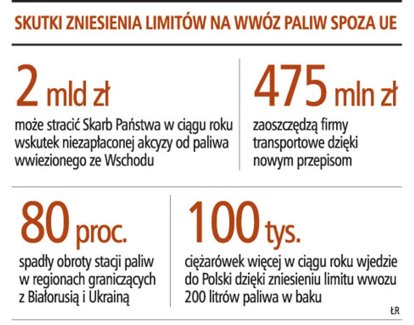1 grudnia 2008 r. zniesiono w bezcłowym przywozie spoza UE do Polski dotychczasowy limit paliwa znajdującego się w bakach. Od prawie dwóch miesięcy każdy tir, zamiast 200 litrów paliwa z Białorusi czy Ukrainy, może do Polski wwieźć nawet trzy razy więcej.