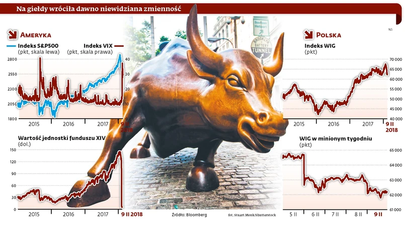 Drugie co do popularności wyjaśnienie spadków na giełdach wiąże się ze wzrostem popularności transakcji pochodnych powiązanych z indeksem VIX, zwanym też indeksem strachu. Mierzy on oczekiwaną zmienność notowań. Jeśli indeks notowań opcji na zmiany cen idzie w górę, oczekiwane zmiany cen rosną, jeśli w dół – maleją. W ostatnich kwartałach VIX systematycznie się obniżał. Rosły zyski (i popularność) funduszy, które liczyły na dalszy spadek zmienności. Jak VelocityShares Daily Inverse VIX banku Credit Suisse, którego aktywa wynosiły prawie 2 mld dol. Gdy ceny akcji poszły w dół, a zmienność znacząco wzrosła, w ciągu tygodnia notowania funduszu spadły o... 96 proc. Konieczność pokrywania strat przez podmioty, które zainwestowały w ten produkt, zmuszała je do sprzedaży innych aktywów, co tylko pogłębiało problemy na giełdzie.