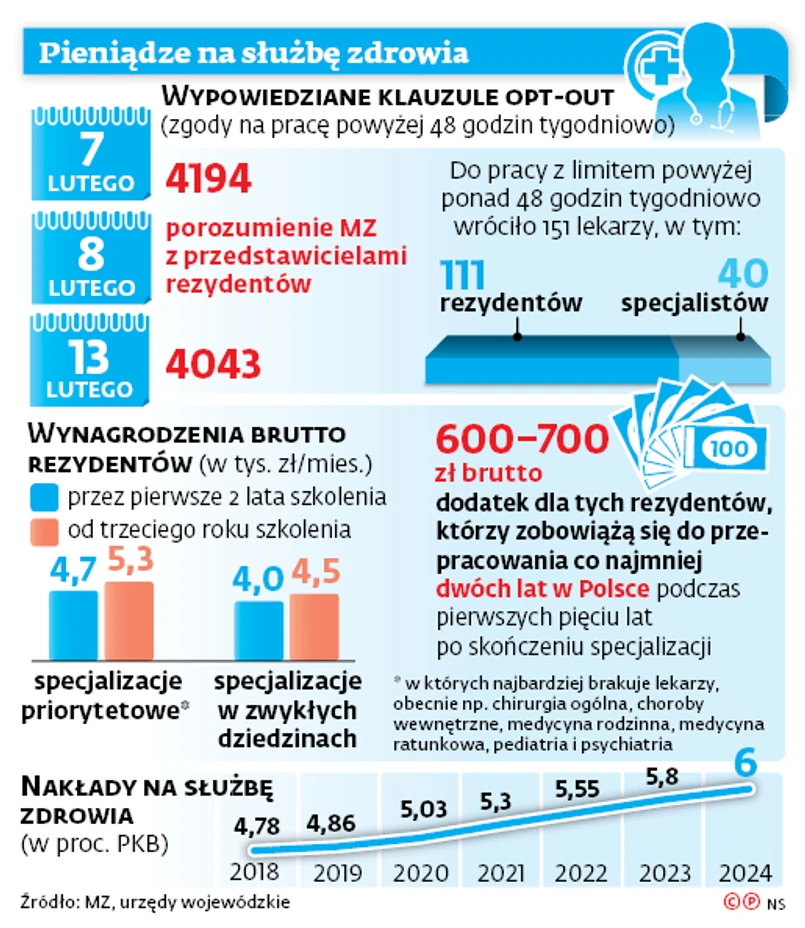 W podpisanym 7 lutego porozumieniu minister zdrowia zaproponował obok wyższych wynagrodzeń dla lekarzy i rezydentów również zwiększenie nakładów na służbę zdrowia do 6 proc. PKB do 2024 r., a także odbiurokratyzowanie pracy lekarzy i wprowadzenie sekretarek medycznych.