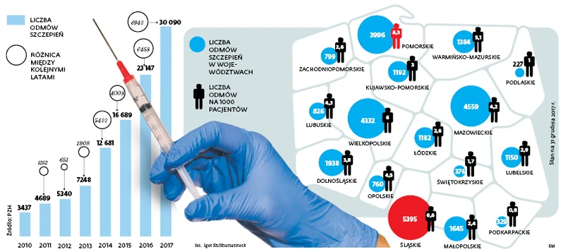 Najgorzej jest na Pomorzu i Śląsku. To tutaj jest największy opór przeciwszczepionkowy: statystycznie odmawia ich odpowiednio ponad osiem oraz ponad sześć osób na tysiąc mieszkańców. Z ostatnich danych głównego inspektora sanitarnego wynika, że głównym powodem odmów szczepień – niemal jedna trzecia przypadków – jest brak wiary w ich skuteczność lub wręcz przeświadczenie o ich szkodliwości. To argumenty, którymi od lat posługują się ruchy antyszczepionkowe, propagujące pseudonaukowe hipotezy o przyczynianiu się szczepień do rozwoju niektórych chorób, przede wszystkim autyzmu. Sugerują też, że firmy farmaceutyczne i lekarze ukrywają faktyczną liczbę niepożądanych zdarzeń, tzw. NOP-ów.