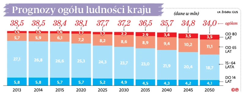 Jak wynika z danych GUS, do 2050 r. liczba Polaków w wieku 65+ wzrośnie z obecnych 7,5 mln do 14,5 mln. W tym samym czasie dzieci do 14 lat ubędzie z 5,7 mln do 4,1 mln, a osób w wieku 15–64 lata – z 26,6 mln do 18,7 mln.