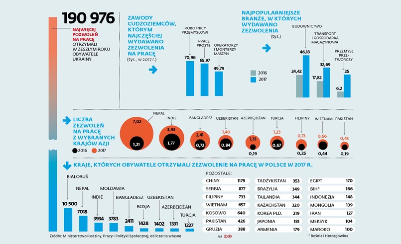 Wśród zezwoleń na pracę wydawanych przez wojewodów gwałtownie wzrosła liczba przeznaczonych dla pracowników z Azji – dla m.in. spawaczy, ślusarzy, elektryków, murarzy, tapicerów, szwaczek, informatyków oraz pracowników do prac prostych.