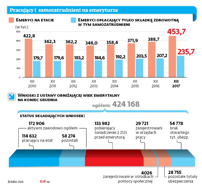 Jak wynika ze struktury osób, które składały wniosek na podstawie ustawy obniżającej wiek emerytalny, do końca grudnia 2017 r. 172 tys. z nich było aktywnych zawodowo. Jeśli zestawimy tę liczbę z danymi ZUS o emerytach opłacających składki emerytalne, rentowe i zdrowotne na koniec roku, okazuje się, że w 2017 r. - głównie w jego drugiej połowie - przybyło 93,5 tys. emerytów aktywnych zawodowo. To pracujący na etacie lub samozatrudnieni.