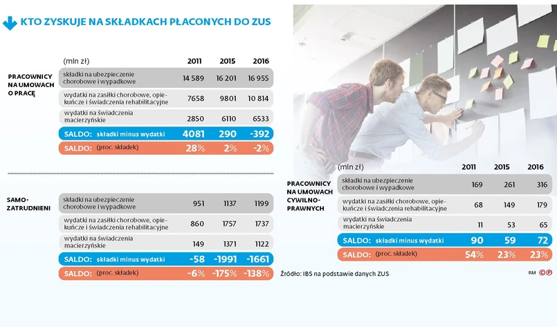 Między 2011 a 2016 r. wydatki z ubezpieczeń społecznych dla tej grupy wzrosły niemal trzykrotnie, z 1 mld do 2,8 mld zł. A składki tylko o 26 proc. W efekcie różnica między wpłatami a wypłacanymi zasiłkami wzrosła na korzyść samozatrudnionych z 58 mln zł w roku 2011 aż do 1,6 mld zł w 2016. Obecnie otrzymują aż 40 proc. więcej, niż wpłacają.