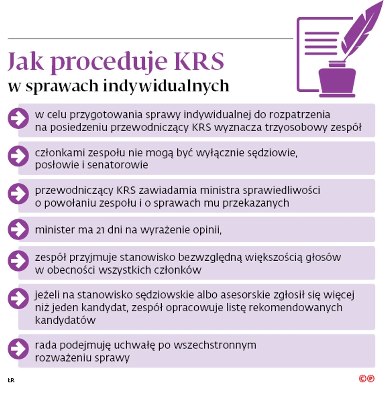 Wszystko przez ostatnią nowelę ustawy o KRS (Dz.U. z 2018 r. poz. 3). W dość znaczący sposób zmodyfikowała ona sposób procedowania rady w sprawach indywidualnych. Te dotyczą m.in. wyrażania sprzeciwu wobec asesorów, wyłaniania kandydatów na sędziów czy też wystawiania opinii o odwołaniu przez ministra sprawiedliwości prezesa lub wiceprezesa sądu (negatywna opinia KRS jest dla ministra wiążąca). Po ostatniej zmianie wprowadzono obowiązek informowania szefa resortu sprawiedliwości zarówno o powołaniu zespołu, który będzie się zajmował tego typu kwestiami, jak i o tym, jakie sprawy zostały mu przekazane. Minister natomiast będzie miał 21 dni na przesłanie radzie swojej opinii, o ile uzna to za stosowne.