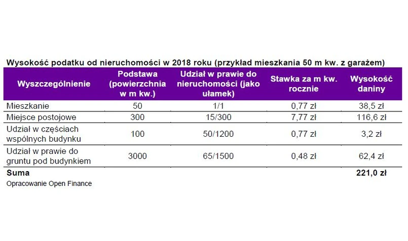 Weźmy pod uwagę konkretny przykład 50-metrowego mieszkania z 15-metrowym miejscem postojowym w garażu podziemnym i załóżmy, że gmina przyjęła maksymalne stawki podatku dopuszczone w 2018 roku. Efekt? Za 50 metrów lokum podatek wynieść powinien maksymalnie 38,5 zł (77 groszy za metr). Do tego dochodzi udział w gruncie pod budynkiem w łącznej wysokości 65/1500 (działka ma 3000 m kw., a cały budynek 1500 m kw.). Trzeba tu zastosować stawkę 0,48 zł za metr rocznie oraz uwzględnić fakt, że udział właściciela mieszkania w prawie do gruntu wynosi 65/1500. W efekcie z tego tytułu gminie należeć się będzie 62,4 zł rocznie.