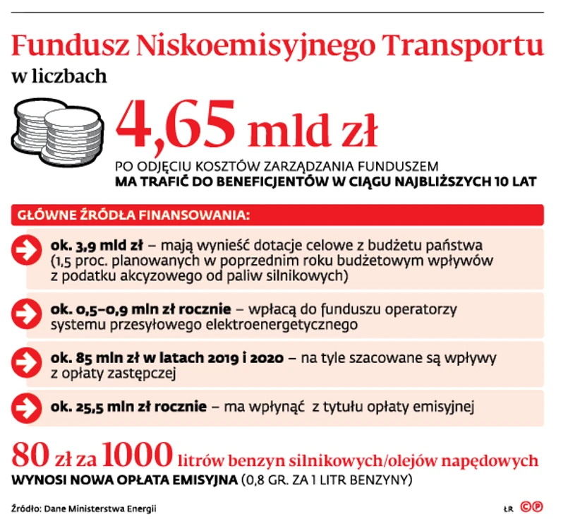 Chociaż FNT ma pomóc samorządom przełamać wstępny impas związany z wysokimi kosztami wdrażania elektromobilności, to na ten inwestycyjny skok złożą się wszyscy zmotoryzowani. Część środków funduszu ma bowiem pochodzić z tzw. nowej opłaty emisyjnej. Będzie ona wynosić 8 gr za każdy litr paliwa lub oleju napędowego. Resort energii liczy, że wpływy z tej opłaty zasilą budżet NFT kwotą rzędu 25,5 mln zł rocznie.