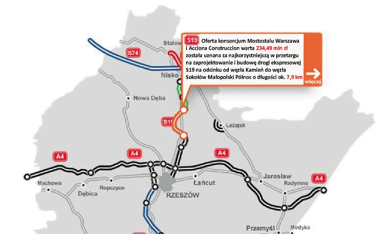 "Kwota 234 491 646,18 zł, oraz 34 miesiące na realizację i 10 lat gwarancji to najkorzystniejsza oferta na zaprojektowanie i budowę drogi ekspresowej S19 na odcinku od węzła 'Kamień' do węzła 'Sokołów Małopolski Północ' o długości ok. 7,9 km. Złożyło ją konsorcjum: Mostostal Warszawa S.A. i Acciona Construccion S.A. Brak odwołań od wyboru oraz pozytywny wynik kontroli uprzedniej Prezesa Urzędu Zamówień Publicznych umożliwią podpisanie umowy na realizację inwestycji" – czytamy w komunikacie.