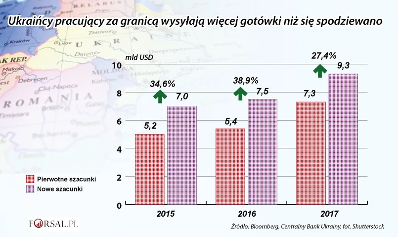 Exodus pracowników z Ukrainy na Zachód powoduje poważne braki kadrowe w kraju i odbija się na wzroście gospodarczym. Bank centralny uważa jednak, że osoby, które wyjechały do pracy do krajów UE, w tym także do Polski, wysyłają do domu dużo więcej gotówki, niż wynikało to z wcześniejszych szacunków. Bank szacuje, że w zeszłym roku na Ukrainę przetransferowano 9,3 miliarda dolarów. To o 2 miliardy więcej niż wynosiły pierwotne prognozy.