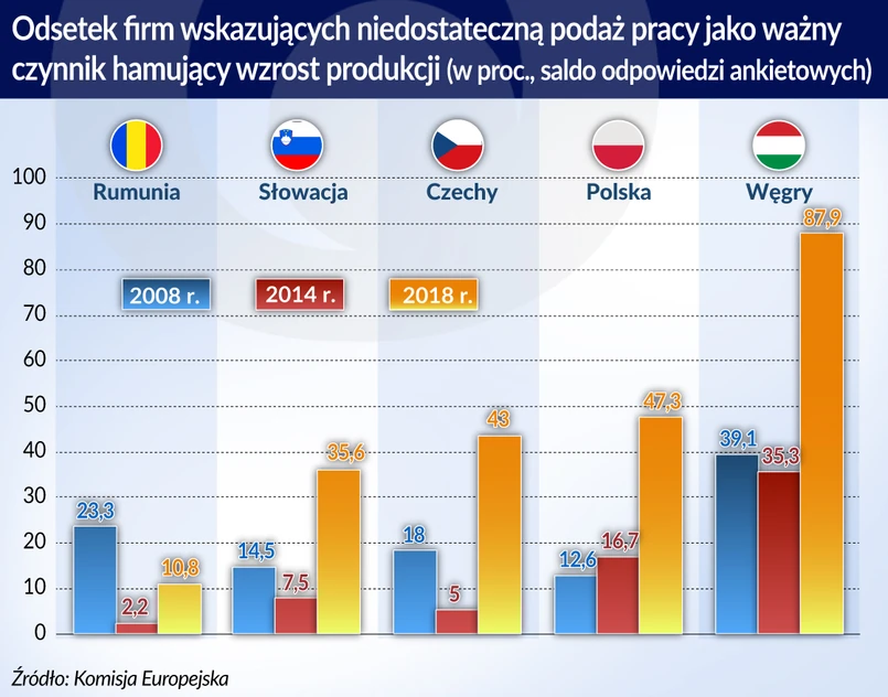 Wydaje się, że niedobór pracowników to obecnie jeden z najważniejszych, jeśli nie największy problem przedsiębiorców w regionie. Wskazują na to wyniki ankiet przeprowadzanych przez Komisję Europejską. Przedsiębiorcy w większości nowych krajów członkowskich UE (poza krajami bałtyckimi) właśnie problemy ze znalezieniem pracowników wskazują jako największą przeszkodę w dalszym zwiększaniu produkcji.