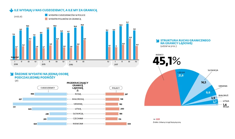 W ubiegłym roku granicę Polski przekroczono 287,1 mln razy. Najpopularniejsza (60 proc. z tej liczby) była ta na Odrze. Wydatki wszystkich obcokrajowców wzrosły w tym czasie o 6 proc. w porównaniu z rokiem 2016. Tylko w IV kw. minionego roku wydali u nas ok. 9,5 mld zł. W tym samym czasie my zostawiliśmy za granicą ok. 4,4 mld zł.