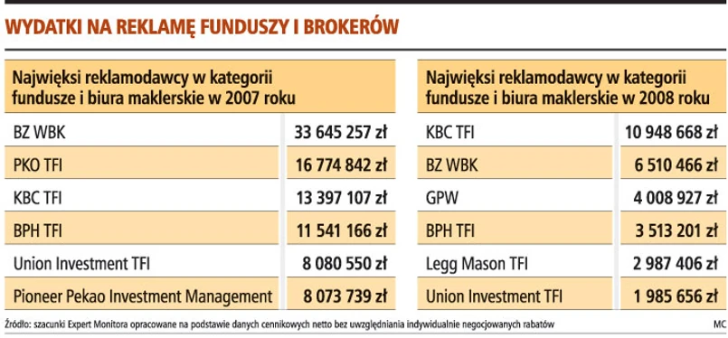 Według szacunków Expert Monitora, na reklamę w 2008 roku mniej wydały też domy maklerskie, 12,8 mln zł wobec 14,5 mln zł rok wcześniej, choć w tej grupie statystykę poprawia GPW. Expert Monitor zaliczył jej wydatki m.in. do kategorii biura maklerskie.