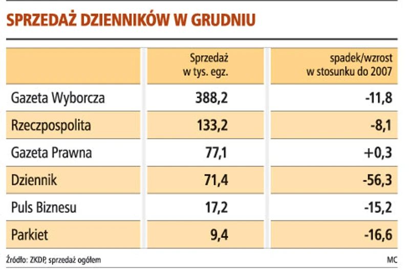 W 2008 roku najbardziej osłabła pozycja Dziennika, którego sprzedaż spadła o 41,4 proc., do 107,5 tys. egz. Ale pozostałe opiniotwórcze dzienniki też traciły. Gazeta Wyborcza pogorszyła swój wynik o 11,2 proc., do 393,6 tys. egz., natomiast Rzeczpospolita - o 6,9 proc., do 135,9 tys. egz. Gorzej radziły sobie także dzienniki gospodarcze. Sprzedaż Parkietu spadła o 10,5 proc., do 10,3 tys. egz., natomiast Pulsu Biznesu - o 8,6 proc., do 18,4 tys. egz. Jedyny sportowy dziennik na polskim rynku Przegląd Sportowy sprzedawał średnio 64,3 tys. egz., czyli o 4,9 proc. mniej niż rok wcześniej. Osłabła pozycja tabloidu Fakt - jego sprzedaż w roku 2008 wyniosła 495,1 tys. egz., o 3,8 proc. mniej niż rok wcześniej - ale tytuł niezmiennie pozostaje najlepiej sprzedającą się gazetą na polskim rynku.