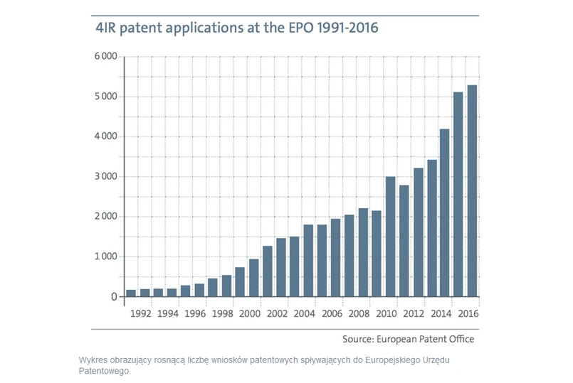 Wydatki na tzw. Business Process Automation (BPA) rosną w skali globalnej. Przewiduje się, że w 2021 roku osiągną poziom 12,7 miliarda dolarów . O szybkim tempie rozwoju procesów transformacyjnych choćby w skali europejskiej może również świadczyć stopień zaawansowania prac badawczo-rozwojowych, który doskonale obrazuje rosnąca liczba wniosków patentowych spływających do Europejskiego Urzędu Patentowego od początku trwającej obecnie tzw. czwartej rewolucji przemysłowej. Wzrost ten obrazuje wykres.