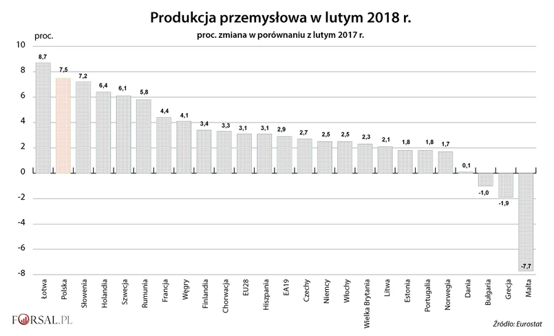 To jeden z najwyższych wyników w UE. W tym samym okresie produkcja przemysłowa wzrosła wzrosła o 2,9 proc. w strefie euro i o 3,1 proc. w całej Unii Europejskiej.