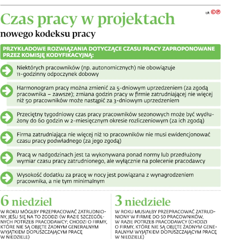 Do ustalenia pozostaje jednak oczywiście zakres zmian. Dla przykładu, zaproponowane przez komisję przepisy o czasie pracy obejmują tak różne rozwiązania, jak zasady zmieniania harmonogramów czasu pracy oraz wprowadzenie – w układach zbiorowych – kont wynagrodzeń, na które trafiałyby pieniądze za przepracowane nadgodziny (firma mogłaby je wypłacać np. w okresie obniżenia wymiaru czasu pracy spowodowanego załamaniem popytu na rynku). Niektóre z tych rozwiązań (np. podwyższenie dodatku za pracę w nocy) są ewidentnie przeznaczone dla zatrudnionych, inne (np. ograniczenie dobowego odpoczynku niektórym kategoriom pracowników) mogą przynieść korzyść firmom. Na forum RDS trzeba będzie zbalansować tego typu propozycje.